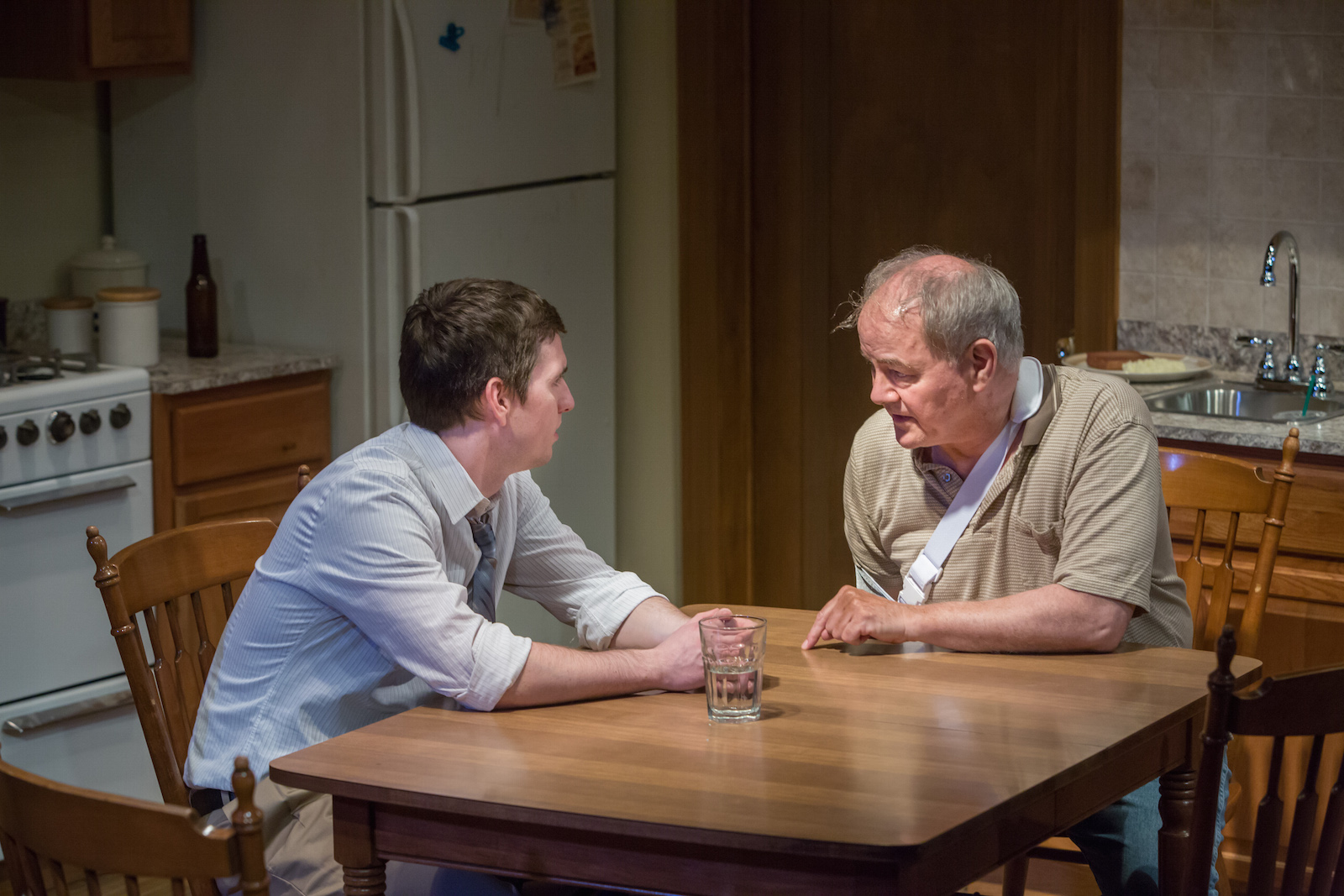 Confused? I know I was. I was unsure what I could expect tonight, except that I have enjoyed the works that this company brings to the stage and director Damon Kiely has put together a solid cast to bring these characters to life. Now let me tell you about this 90 minute drama (with some comic touches). The play opens in the kitchen (this set is amazingly clever by Collette Pollard) of father, Leo (the always reliable and perfect Francis Guinan) and his son Albert (deftly handled by Alex Stage). Albert is heading off to college and is explaining to his dad how he has arranged everything so that his dad will not have to worry about money at all. While this seems a little strange, we learn that his retired dad has some problems when it comes to money and what he does with those dollars that he gets into his hands. I won’t tell you more as it is best for you to watch the saga unfold.