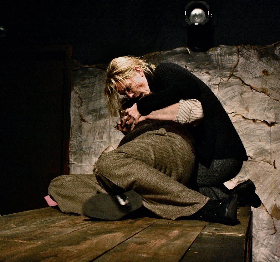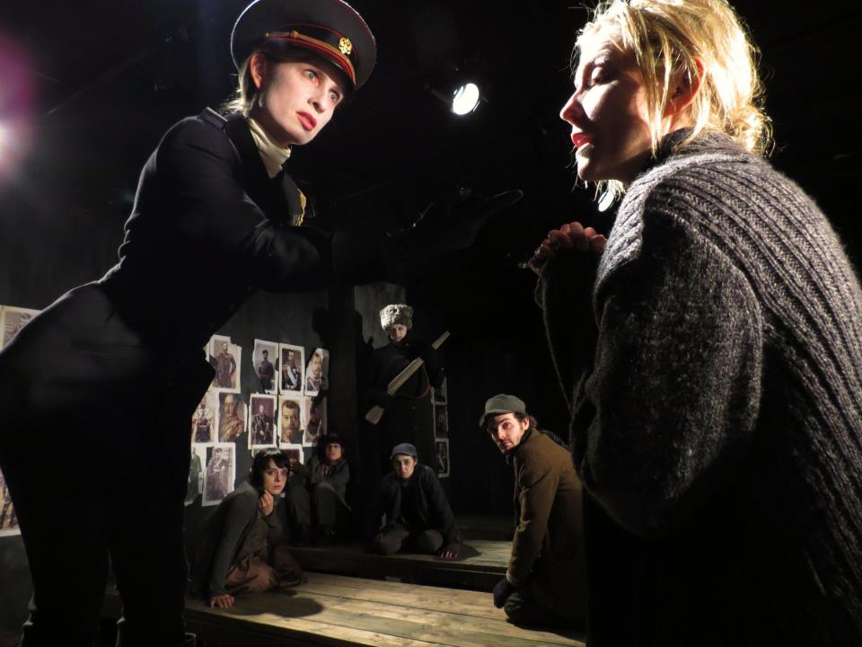 Their current production, “The Mother” is a musical adaptation of Bertolt Brecht’s 1930’s play that was designed to be a learning play ( Lehrstucke) in order to teach the German’s about the Russian community as they get involved with conflicts between labor and government, and one widow’s plight to save her son, an activist , from imprisonment or worse.Translated by Steve Gooch, with Music by Jonathan Guillen( from the original by Hanns Eisler), this is a very dark production, set in their storefront in a way that the audience almost feels the heartbeats of the actors.There is no real set; we enter the room, filled with large tables, some with chairs and some with stools. On each side of the performance area, there are screens so we can watch the videos of what is going on( video design by Jeremy Clark). There are actors in place when we enter, frozen in poses of every type and when the production begins, we are smack dab in the middle of a labor strike situation. The workers want more money, the owners will not give it to them and the militia is there to fend off any rebellions or strikes.