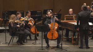 This was followed by C.P.E. Bach’s “Cello Concerto in A Major, Wq 172. The rendition by Paul Dwyer was technically proficient and rapturous, but I was somewhat disappointed that he had not memorized the solo. What this meant was that Dwyer was seated behind a music stand before the audience, and the stand blocked some of the sound emanating from his cello. The unfortunate result was that the balance between his instrument and the others in the orchestra was not what it should have been. It was only when fewer backup instruments played that the balance improved. In addition, because Dwyer’s sound was being blocked, his cello didn’t seem to have as resonant a tone as it should have, that is, as I listened from my particular location in the audience.