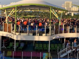 We left O’Hare on a United flight to Miami. I was pretty nervous about it all, not wanting a repeat of my previous experience, especially in front of my grandkids. We arrived in Miami, took a cab to a hotel where we applied the patch and had a somewhat restful evening. The next morning, we checked out and prepared to be picked up and taken to the dock where this humongous ship was waiting. I could not believe my eyes! This ship was like a city on the water. We got settled into our cabin on the 8th floor ( aft, overlooking the water) and started to walk around to see what we were going to spend a week living in or on.