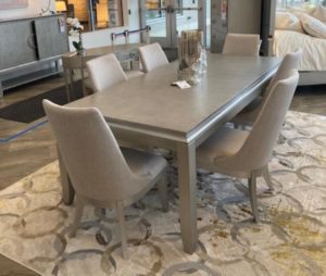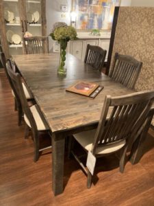 Funny thing about shopping. Often, we walk past something several times and then later find that this was the perfect item. This took place today. When we came into the building, we spotted a table that was almost perfect. Six chairs and a leaf that would allow for up to 10 ( we could move our Kitchen chairs into the dining room for larger parties). The color fit our scheme and with the full extension, the table and chairs would work for our family ( and extras). After Bill went ove some of the ites that we had looked ta and our custom design, Jane mentioned that we had seen a set in the foyer/entry. He said, let’s grab a tape measure and go take another look. Jane’s eyes lit up! It was perfect in size and with all the discounts it was right on target with our budget.. That was easy, wasn’t it. The only extra I bought ( besides delivery) was a five year insurance package that covers the wood, the upholstery and makes sue that our guests ( and family) will always be dining in style and comfort.