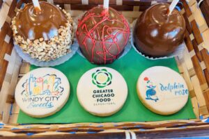They will be featuring 3 kinds of caramel apples (As seen above)  They will also be featuring the caramel apples along with custom GCFD, Windy City Sweets and Dolphin Rose cookies near the cash register and…the caramel apples will also be featured near their front door as well!