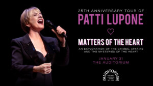 ***** How do you end the longest January Chicago has known in recent years? On a frigid Saturday night, Jane and I made our way to The Auditorium at Roosevelt University to see a one night only concert, “Matters Of The Heart” featuring the one and only Patti LuPone. We arrived early as traffic was light. As we entered this amazing venue, we could feel the excitement of the evening. LuPone, a three-time Tony Award winner was going to bring us some wonderful music and her unique styling of works from Broadway favorites to contemporary writers.