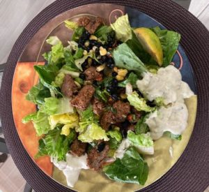 The ingredients are boof, vegetable oil, garlic, chili powder, cummin, smoked paprika, cayenne lettuce, corn, black beans, scallions, cilantro, corn tortillas ( which I opted not to eat, but looked terrific), salt, pepper and a slice of lime to be squeezed over the salad prior to adding the dressing ( ranch is included).![]()