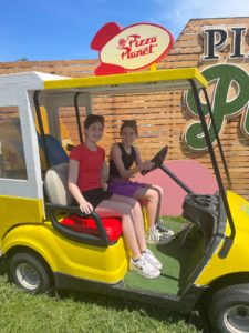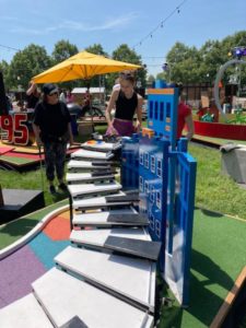 The concept of min golf with characters and scenes from familiar Pixar films helps the kids feel at home. Sarah and Noa had fun but found the holes to be close to impossible to master. Both of these girls are athletic and have played the aforementioned courses, with ease. They truly struggled with this one. Part of the struggle was that some of the patrons did not follow the order of holes, but moved around to empty ones and then came back to fill in the gaps.