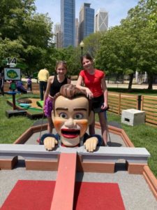 Let’s face it, those who are visiting Navy Pier are there for fun and games and some great food. They are not entering into a game of mini golf to win awards. Since the ultimate goal is to have fun, here you will find success and happiness. Yes, you will have some shots that will just fall short of what you feel you can achieve, but guess what? The others in your group will have the same problems. I scored a 6 on the very first hole ( that is the max you should allow) but had twos and threes for the other 17 holes.  Both Sarah and Jane had a hole in one ( hard to do in any mini-golf course, but almost impossible to even consider at this course.