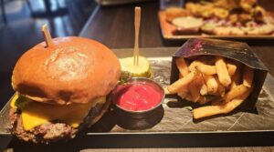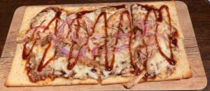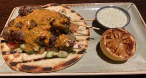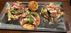 Chicago Tailpipe- a spring filled roll with Italian beef, special cheese and horseradish with two dipping sauces ( $1 for every order is donated to a local charity), Mediterranean Lamb Skewers – marinated lamb, cucumber and some sauces with a kick, an OG Burger ( brisket,chuck and short rib patty, pecan wood bacon, roasted jalapeno cream cheese, chipotle aioli and house made pickled jalapenos- delish! with fries, and one of many flatbreads The Pitmaster ( pretty close to a good pizza ( Jane did not want the sausage flatbread and on this one she asked for no Jalapenos).
