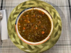 Today’s flavor of the day, vegetarian Lentil soup. It is delish! Flavorful and richly satisfying. The lentils, carrots, celery and vegetable broth make for a wonderful lunch ( with a few oyster crackers, or not). The amazing soup can be reheated on the stove or in a microwave ( I did it both ways) and both keep the flavors as if you were enjoying in Sarah’s restaurant, The Prairie Grass Café located at 601 N. Skokie Blvd. in Northbrook.