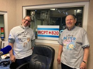 Frank and I , on our show WCPT820 Around The Town spoke about the t’s we ordered, mine with Benji and Lucy saying ” Life is Better with” and then the pictures of Lucy and Benji-