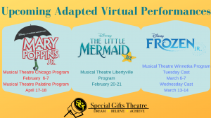 Special Gifts Theatre is headquartered in Northbrook, Illinois, and has just completed its third successful season in Libertyville. The next show available for viewing will be Disney’s “Frozen (Jr.)”, by the musical theatre in Winetka program. The Tuesday cast will be featured on March 6th and 7th, while the Wednesday cast will be featured on March 13th and 14th.