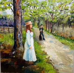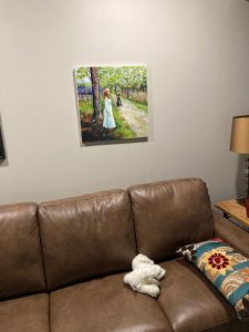 When we wnet to Munster to see her show, she also had on display, some of her artwork. I was mezmerized by one of her paintings which I called “Sunday In The Park With Cory” and asked her if I could purchase it. Jane and I were moving and I felt that this picture would be perfect for my office ( also known as the second bedroom). She said yes and then we left. Recently, we made the move.