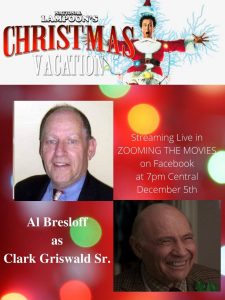Want to hear a reading of a movie favorite? You can on Facebook. Thanks t Kevin Pollack and a host of area performers, the show will go on. This week-end I was asked to hang up my keyboard and get out my make-up kit ( just an expression) so I could join the talented cast of  “National Lampoon’s Christmas Vacation”, a ZOOM reading.