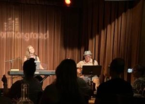 The stage was then taken by Cory Goodrich, who I have watched grace many a Chicago area stage in all types of roles. I have also seen her grown as an artists ( with one of her paintings hanging in my office) and of course I have read her biography and have interviewed her on my radio show. I would have to say that I am one of her many followers. Cory plays many instruments and of course started out with the guitar. She told stories during her set to set up the songs that we heard. One was about a play that she did called “Dogs the Musical”. While Cory has had the experience of being in shows that might be called “dogs”, she is always at the top of her game and gives the audience 110%. Cory is charming and has style and grace. Onstage with her is Jacob Sweet who is dynamite as a back-up and I would think that he is even stronger when he is the performer. As a side-man he is terrific.