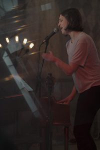 Over the course of the one-hour performance, the focus moved away from a more medieval sound to a more contemporary one. This included fusions of Joyce’s voice with various musical and rhetorical accompaniment, often supplemented by videos of her disabled left hand. Some songs had additional sound tracks behind them, and in at least one, Joyce—who has an incredible vocal range—was singing simultaneously with herself. The last song “Form and Flee” included recorded backup voices. Reverberation and intentionally echoey sounds continually predominated among the sturm und drang.