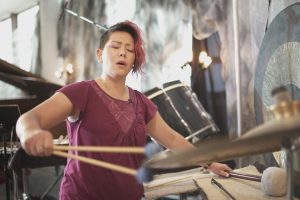 While Zelasko’s voice is absolutely thrilling and Duvall’s percussion is brilliant and spot-on, several microphone problems plague the performance throughout. The worst occurs during the song “River”, when Duvall uses the same microphone for his voice and his instruments, making it difficult to understand Burtner’s original prose and poetry. His words are dreamy and meaningful, and we shouldn’t have to strain to make them out. The sound mixer, to their credit, tried very hard to compensate for this sound design flaw by increasing the gain on Duvall’s microphone. But it didn’t help much when the percussionist would move closer and farther away from the mike as he played various instruments. I would suggest that in future performances, a separate individual should be given a solo microphone dedicated to reciting the words in a voice entirely different from Duvall’s. His unfortunately lacks the right expression and tambre for the occasion; maybe a vocally-trained bass voice would better serve to contrast with Zelasko’s gorgeous soprano.