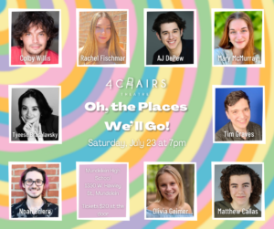 The cabaret format showcasing young talent is the brainchild of Lauren Berman, who has also directed musicals at Glenbrook South High School , Stevenson High School and The Metropolis Performing Arts Centre. During the pandemic there were, of course, no live theater performances, and Ms. Berman saw that a void in theater performances had to be filled. (Besides, Ms. Berman is one of those people who can’t not do something.) After founding 4 Chairs Theatre in 2018, Lauren produced several small venue cabaret productions in 2019. In 2020, at the height of the pandemic, she produced two virtual cabarets which raised over $3,000 each for two separate charities. Going into 2023 she hopes that the company will return to regularly scheduled live performances in the spring and fall, supplemented by live cabaret performances.