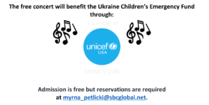 Donations will be accepted at the concert to benefit UNICEF USA’s Ukraine relief work by check made out to UNICEF USA or cash.