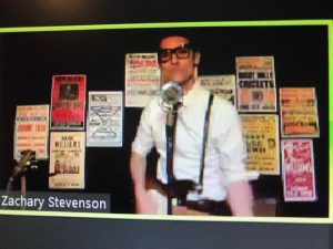 To begin, they utilized the talent of Artistic Affiliate Zachary Stevenson, who many might recall sold out the theater’s production of “The Buddy Holly Story” ( winning a Jeff Award). He has an amazing ability to become a “dead ringer” for Holly and does a great job doing Phil Ochs, Hank Williams and Jerry Lee Lewis. By the way, in last night’s show ( this was a one time concert enjoyed by a “full computer” from all over the globe, he even snuck in a little BeeGees when he spoke about the Disco Era.