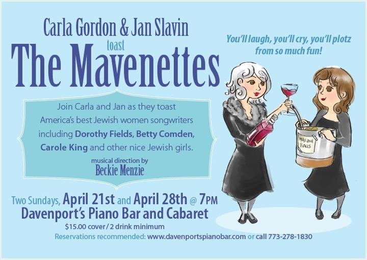 Davenport’s Piano Bar and Cabaret is one of “the places to go” in Chicago if you are looking for a solid drink along with some truly spirited performers. Due to my theater schedule ( and of late, we have a play every night and double headers on Saturdays, boy Ernie Banks would be proud) I cannot get to all the marvelous cabaret performances. Coming up are two ladies that I have seen perform as solo’s, now together in a new act called “The Mavenettes” as performed by Carla Gordon and Jan Slavin with the talented Beckie Menzie at the keyboards.