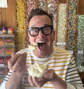 Here we are- Memorial Day Weekend- the Summer starts and we are once again, challenging “Out Chicago” to an Ice Cream contest. We met today at our favorite “sweet shop” in Chicago- Windy City Sweets and our host John Manchester “The Candy Man” ( who also took the photos), allowed each of us to make our selection- to avoid problems, we agreed to eliminate Chocolate and Vanilla as flavors.