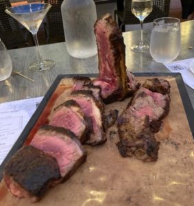 Rather than go through the entire menu, we had noted when we were doing our review an item called The Bistecca Florentine King of the Steak- 45 ounces of steak, so why not? forst we did have some drinks and as an appetizer some delicious crispy brussel sprouts with a tangy sauce. We also ordered Casati’s Bianca Pinsa ( White Pizza) a wonderful thin pizza with a perfect crispiness to the crust.