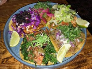 Broccolini ( grilled broccolini, grape pico de gallo, avocado cream , puffed rice and microgreens. The tacos are served as doubles for sharing. They are very generously served with enough to make two. The second was Cochinita Pibil (slow cooked pork, cilantro and habanero onions).