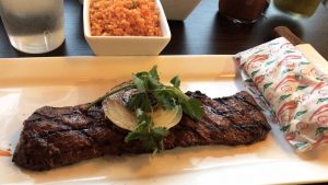 Rather than select from the menu, we allowed the staff to bring out the items that are the most popular and ones that chef Diaz loves to prepare. Of course we began with a special arrangement of fruit with guacamole and chips. Later, we had their special salsa with more chips ( very tasty as side).  They have a lot of taco choices ( at $4 and $4.50)- we did the  3 Specialty Tacos served with rice and beans, but they made it 4. steak, Grilled Mahi, grilled shrimp  and Al Pastor (pork). FYI- they bring three sauces to the table, mild, a bit spicy and then the green ( not for cowards-Caitlin was in heaven).