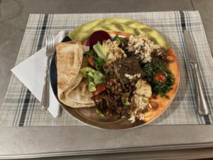 Beef marinated in a mint marinade served over rice with tabouli toom ( home made pickled beets and turnips-DELISH) and pita bread. There is an option for Lebanese salad instead of the tabouli.