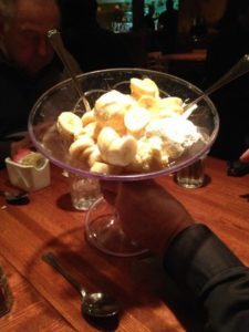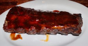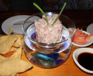 We began our meal with some appetizers. We had a 1/2 slab of BBQ ribs ( a great way to try without a full commitment). FYI-The ribs are dry rubbed and only smoked daily for 3 1/2 hours with hickory and mesquite woods. Truly delicious and the sauce has the perfect tang. If you order the dinner portion, the sides are peanut brittle baked beans and tater 6’ers.We also had the tuna tartar and if you notice, there is a fish in a bowl as part of the service. He did not pose easily for the shot, but Barry got it!. The third item was The pulled pork taster. One can tell that this meat had been smoked to perfection ( as were the ribs) and the flavor on the pork is dynamite.