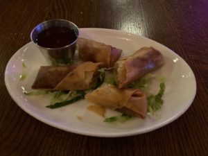 Jamaican food is prepared with some “heat” and some items have more of a kick than others. Frank started with a Manhattan and I enjoyed a very well poured Vodka martini. Jane is into water when she cannot decide, so that was her drink for the evening. For our appetizers we selected Shrimp Spring rolls and Oxtail Mac& Cheese ( this is a new menu item- they also offer Lobster or bacon mac n cheese). I loved the flavor and since I am the Mac guy I will say this was something very special. I am sure the other choices would be up to the same level and Jane already said “Next time it is the lobster”. There are a great many choices so you can come often and never repeat.