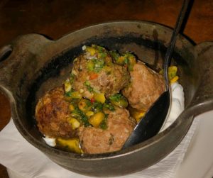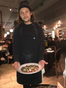 For our entre’s we opted for the Lamb Meatballs (with pistachio chimichurri and mint yogurt) along with the Beef Carpaccio ( pickled lemongrass, puffed quinona, confit pear, apple and tarragon) that the chef brought out to us himself. An amazing flavorful experience that you just roll up and devour.
