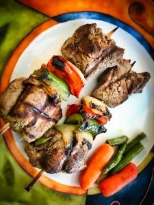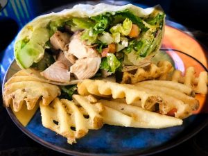 There are a number of ways to eat their chicken wings ( BBQ, Buffalo Siracha, Asian Gochujang and tropical Habanero- all good, some spicier than others. We skipped past the grinders ( what a selection they have as well as the “on a bun” section of the menu and the fabulous Gyros to the SOUVLAKI-Skewers. Served with Greek potatoes over a bed of rice, veggie garnish, pita bread and a small salad, we enjoyed two of these- The Filet Mignon plate and the Chicken plate. Both were juicy even without using the tzatziki sauce on the side.