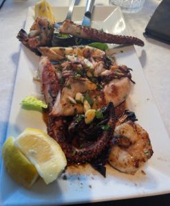 Our appetizer was Tutto Pesce Alla Griglia ( grilled shrimp, octopus and calamari in an EVOD balsamic garlic glaze). The flavors were terrific and I have never enjoyed octopus this much. By the way, they have a huge menu and every night they offer specials. Since we never know when our reviews will be read, we shy away from the “specials” and stay with the standards, but from what I am told, the specials they offer are sensational.