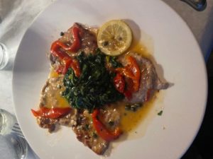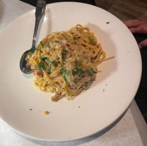 We had two veal dinners: Marsala- sauteed with mushrooms and onions in a marsala wine sauce and the other , Piccata- sauteed in a lemon wine sauce with capers, red peppers and pepperoncini. They also do chicken using he same sauces and techniques plus they have several other alternatives. There are many fish meals and two other steak options to choose from and when it came to pasta, which we knew we had to try one of, there are so many choices. Ravioli, Lasagna, Alfredo, Gnocchi ( next time for sure), Alfredo, Tortellini Alla Paesano and the one that we opted to try, Carbonara-onion, pancetta and egg- delish!