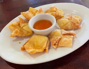 Jane and I started our evening, seated in the dining room, with an order of crab rangoon that was just the right crispiness. The sweet and sour sauce was home-made and the flavor better than I had in a long time. We also had Thai Spring Rolls with a plum sauce. The appetizer list is plentiful.