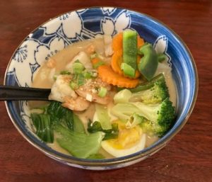 The next course was sharing a bowl from their Ramen Time menu ( Japanese) where they have a special menu and they have made it easy to order, so you look like an expert. We had the chicken broth (regular) with veggies and shrimp. Of course it is loaded with noodles , so one may think of this as the “soup” part of the dinner. There are many options and choices so you could dine at Jimmy’s every week and not duplicate the Ramen part for many months. While it is located in the same place, they do have a special website www.ramentimedeerfield.com for online orders but use the same phone number 224-235-4650.