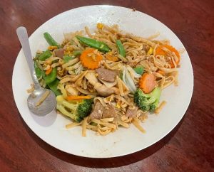 The next items that we shared was a stir fry ( again a lot of choices). Ours was the Cashew with pineapples, pea pods, bell peppers, carrots, broccoli, mushrooms and steamed white rice. That was followed by Golden Noodles, an amazing dish that is called Thai style Lo-Mein ( stir fried egg noodles with egg, carrots, peapods, mushrooms , broccoli and added shrimp.