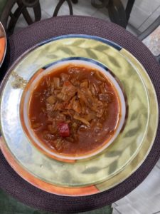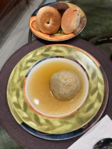 The Continental Restaurant has won awards for their soup and tonight, I brought home two ( along with fresh rolls, crackers and butter) Matzo Ball soup and Sweet and Sour Cabbage. Jane and I were once again in “heaven” .
