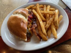 In fact, we decided to share one of their renowned sandwiches, the OMG Burger ( for” “Oh My God”, and it was !) Half Pound steak burger grilled to perfection with slices of three cheeses ( Swiss, Cheddar and American), roasted red pepper, hickory smoked bacon, grilled mushrooms and onions on a toasted bun. By the way, the fries were amazing!