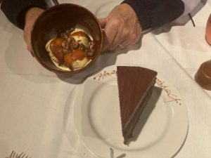 Being my birthday, Sarah had them bring us a slice of their Double Chocolate Cake and a dish of ice cream ( vanilla with toffee and chocolate almonds)- what a wonderful birthday dinner!