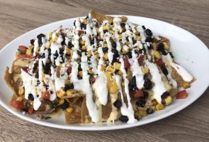 Jane and I stopped by the Evanston location, met Josh Keating ( the man behind the concept) and went over the menu items. WE gave him our preferences and while we  waited for them to be prepared, we sat in their very clean outside area as we enjoyed their Hummas and Naan appetizer. This is a VEGAN dish , and the roasted corn nachos ( roasted corn, black beans, jalepenos , pico de gall, pepper jack cheese, corn tortilla chips, topped with S & F crema. DELISH! The other “shared” items also look very good!