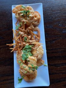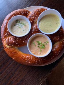 There is an old restaurant trick that our friend Alan told us about. Restaurants either list the most popular of items first on the menu, or the ones most profitable. In our case, I believe that Lisa puts the items that are more popular. This being the case, we started off with the Cosmic Shrimp platter ( a lightly  breaded deep fried shrimp platter topped with house made potato straws  that was perfect for four of us to share) and then an item we saw at every table , the Ginormous Pretzel served with three sauces ( bacon /mustard, beer cheese and and queso blanco) was more than ample for all of us and leftovers for Sunday as well.