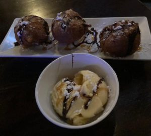 While we were all fully satisfied ( they say there is always room for dessert) we decide that the dessert on the menu was a MUST to try. Besides a scoop of ice cream ( which we had one of as well) they offer the Deep Fried Oreos. Hold on to your hats: 3 deep fried, sweet vanilla battered oreos drizzled with chocolate sauce, caramel sauce and powdered sugar. The flavor is amazing- something very special.