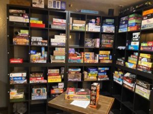 At your table you will also find menus and a code that you can use your phone to download and then place your order. Then you can either sit and enjoy your friends or beverage and wait for the food to be served. It is that simple. When you came in, you might have noticed the wall of shelves filled with board games and card games from different eras. Over 200 games await your desire. Some have a cost involved and others are free. You pick the one you want and take it to your table where you can start to play while waiting to order or waiting for your food. Your choice ( and they allow you two hours- no rush!.
