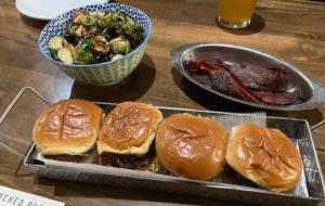 We started with three of the appetizers: Crispy Brussel Sprouts (pan seared to perfection tossed in a balsamic glaze), Short Rib Sliders ( topped with Havarti Cheese, onion jam and chili mayo) and the very special Candy Bacon (hardwood smoked bacon with brown sugar and cayenne pepper_- all were delicious treats. Next time, and there will be a next time, we will try the chicken sliders, nachos and wings.