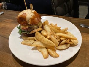 Since they are a gastropub, sandwiches galore line the menu. The Adult Grilled Cheese instantly became a favorite of mine. Those of you who read me regularly or listen to the radio show know that I love grilled cheese. This is another special made with Hovarti cheese as well as Fortino cheese pear and fig jam on sourdough bread grilled to perfection, blending all of these flavors into a unique and special treat. Knowing that the slider was terrific, we also went to the Pub Burger ( this one is short rib and brisket with chuck blend beef. They apply the special PUG sauce as well as iceberg lettuce, dill pickle, shaved onions, white cheddar and some more of that wonderful bacon on a pretzel roll) and our third was their Lobster Roll Style Salmon Sandwich ( chunks of salmon mixed with celery creating a lobster roll appearance on French bread). I love Lobster Roll, and of course this tastes like salmon, so this was not an exciting choice ( tasted good but I guess I was hoping for a different taste). There are a host of other sandwiches and they have some actual dinners, salads and kids meals to please everyone in the family or group.