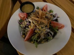Jane and girl Cari did the salads- the Santa Fe Salad is a delight: mixed greens, tortilla strips, blackened corn, black beans, tomatoes, cheese and red onion. Options- you can add chicken , steak or shrimp. we also ordered the Waffle Nachos- wow! waffle fries, smoked chicken, chili, cheddar and chihuahua cheeses, house pickled jalapenos, lettuce and tomato and of course sour cream. This was amazing!
