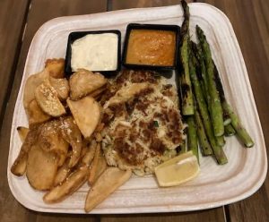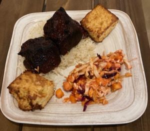 The meat dish selected was the Lilikoi BBQ Braised Short Ribs- slow boiled boneless beef short ribs glazed with their signature Lilikoi BBQ sauce served over rice with delicious corn bread and pineapple slaw ( about as tropical as one can get with meat). Meat-lovers: they also have a skirt steak that looked divine and “The Harbor Filet ( topped with lobster and crab gruyere that I will try next visit). FYI- Lobster rolls are on the menu and they have another offering that looks very special ( and tempting) in their sandwiches- Grilled Cheese and Short Rib- sounds perfect for a Sunday afternoon!