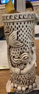 The cocktail menu is filled with wines ( bottle or glass), hand crafted beers, specialty drinks galore and of course tropical beverages. Many of their special drinks are rum related ( of course) and so Jane and I both had the “painkiller” ( myer’s dark rum, Rumhaven Coconut rum, cream of coconut, pineapple juice, orange juice, topped with fresh nutmeg and a piece of pineapple served in a special TikiRob Glass ( no you do not take the glass home). Frank opted for the Mr. Sunshine Killer Bee, again rum based with Rumhaven Caribbean rum, passion fruit juice, honey and club soda. This was also served in their special TikiRob glass.. I truly enjoyed my cocktail ( having two) and did not miss my vodka martini at all.