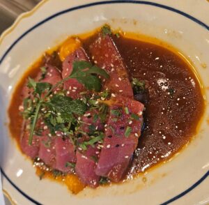 For our three entree’s, the Branzini, ahi tuna and some pretty amazing Fried Chicken with an awesome side of Mac n’ cheese ( worth the trip just for the Mac n’ cheese). The fried chicken is boneless and the mac n’ cheese divine. The Osso Buco is a classic Italian dish of veal shanks with veggies- very tender and even our Italian ( Frank) said “nothing better- ever! the last main dish was the Tuna Tiradito which came with the appetizers, but stayed with the main dishes as it was too good to let Frank take home to his family ( it was amazing!) it is sashimi ahi tuna, avocado, lime, soy aji Amarillo, jalapeno, cilantro and sesame ( yum!).